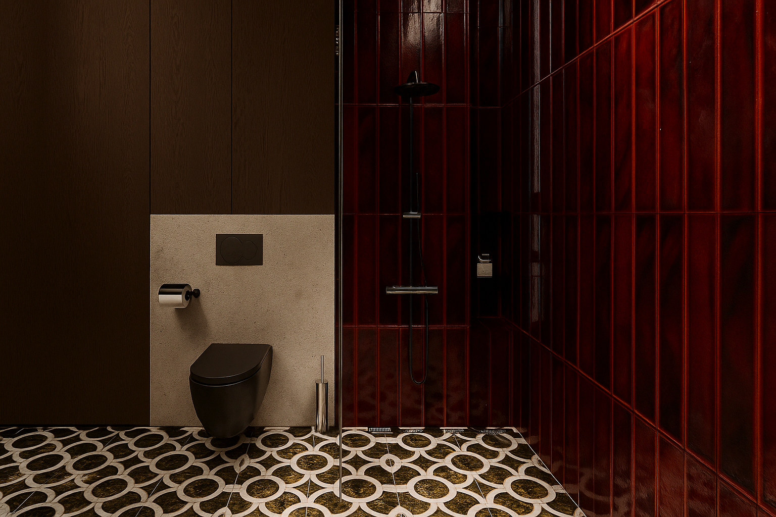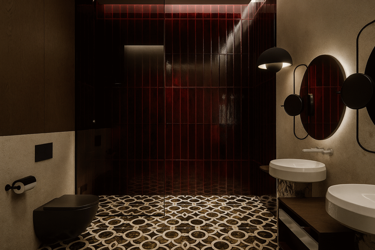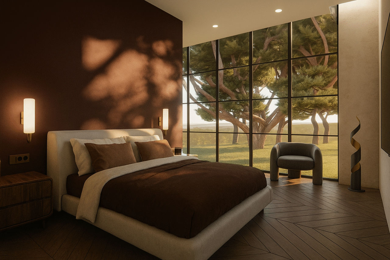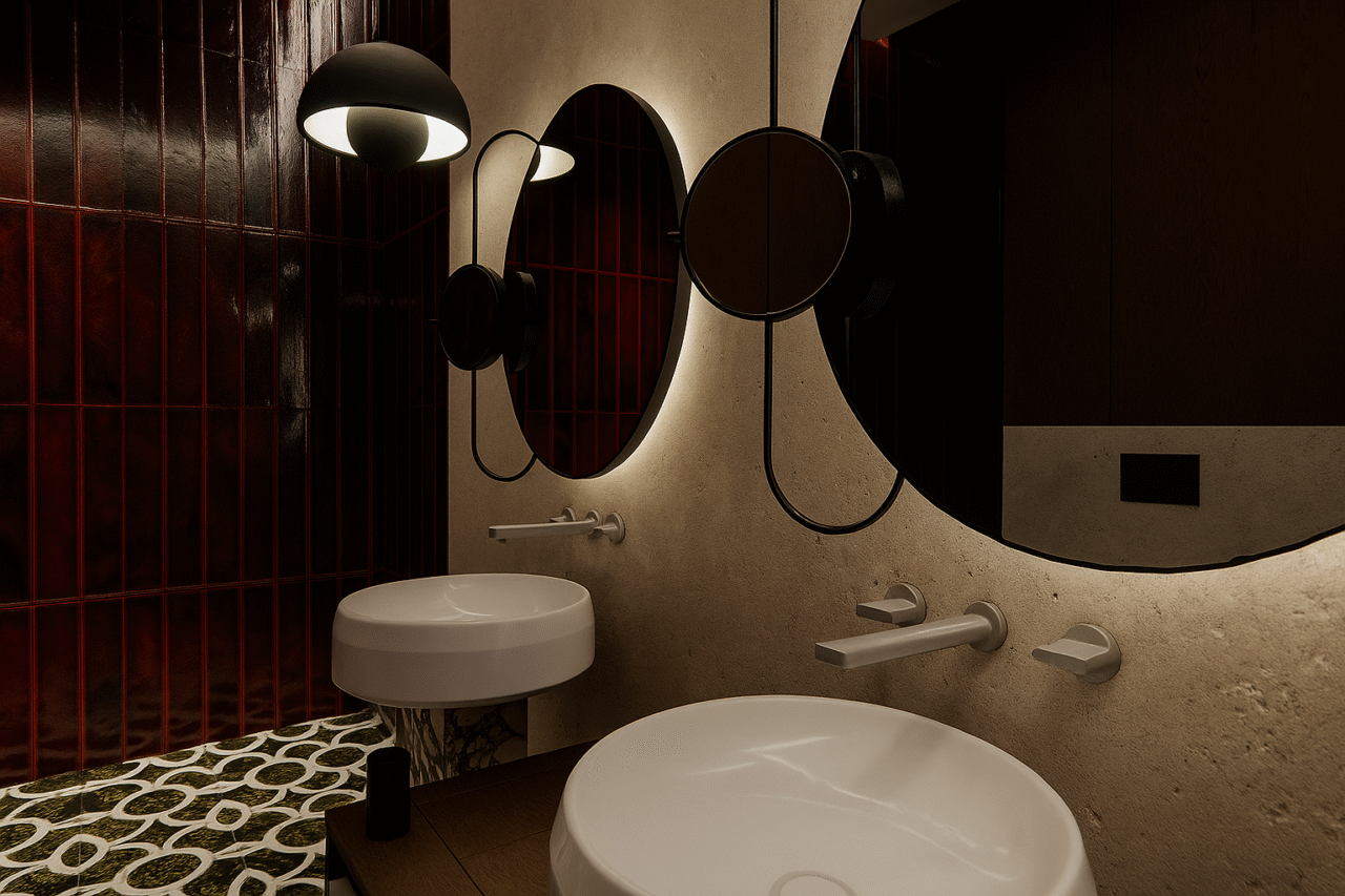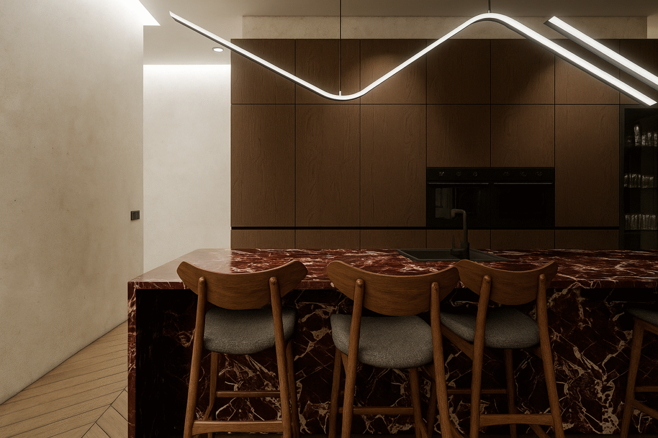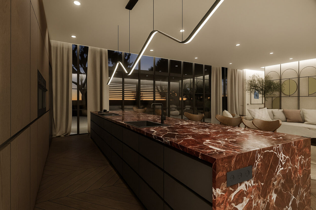 Jaukus individualaus namo projektas. Šiame interjere dominuoja tamsiai raudonos spalvos motyvai, kurie kuria šiltą, itališko stiliaus atmosferą. Erdvei suteikiamas subtilus prabangos pojūtis, o spalvų gylis harmoningai dera su natūraliomis medžiagomis ir minkšta šviesa.